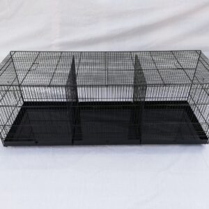 This cage has a metal pull out tray with metal front flap and a wire floor. It has two doors in the front and one to the side, either of which can be used for a bath or nest pan. It has a metal internal trough feeder and a carrying handle