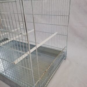 This cage consists of white plastic trays and front flaps. It has 2 doors to the front and a door either end of each cage suitable for either a bath or nest pan. It comes with a metal divider, 2 wire grills, and 4 x feeders, 4 x perches and two carrying handles