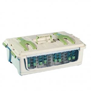 Made from plastic. Size 66.8cm x 34.3cm x 21cm. Complete with feeders and drinkers. Additional Lid also available with handle.